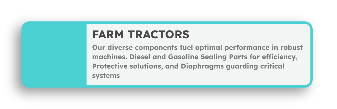We manufacture a comprehensive array of components vital for the optimal performance of these robust machines. From Diesel and Gasoline Fuel Management Sealing Parts that ensure efficiency and durability, to Protective Parts and Diaphragms that safeguard critical systems, our products stand as a testament to our commitment to excellence.